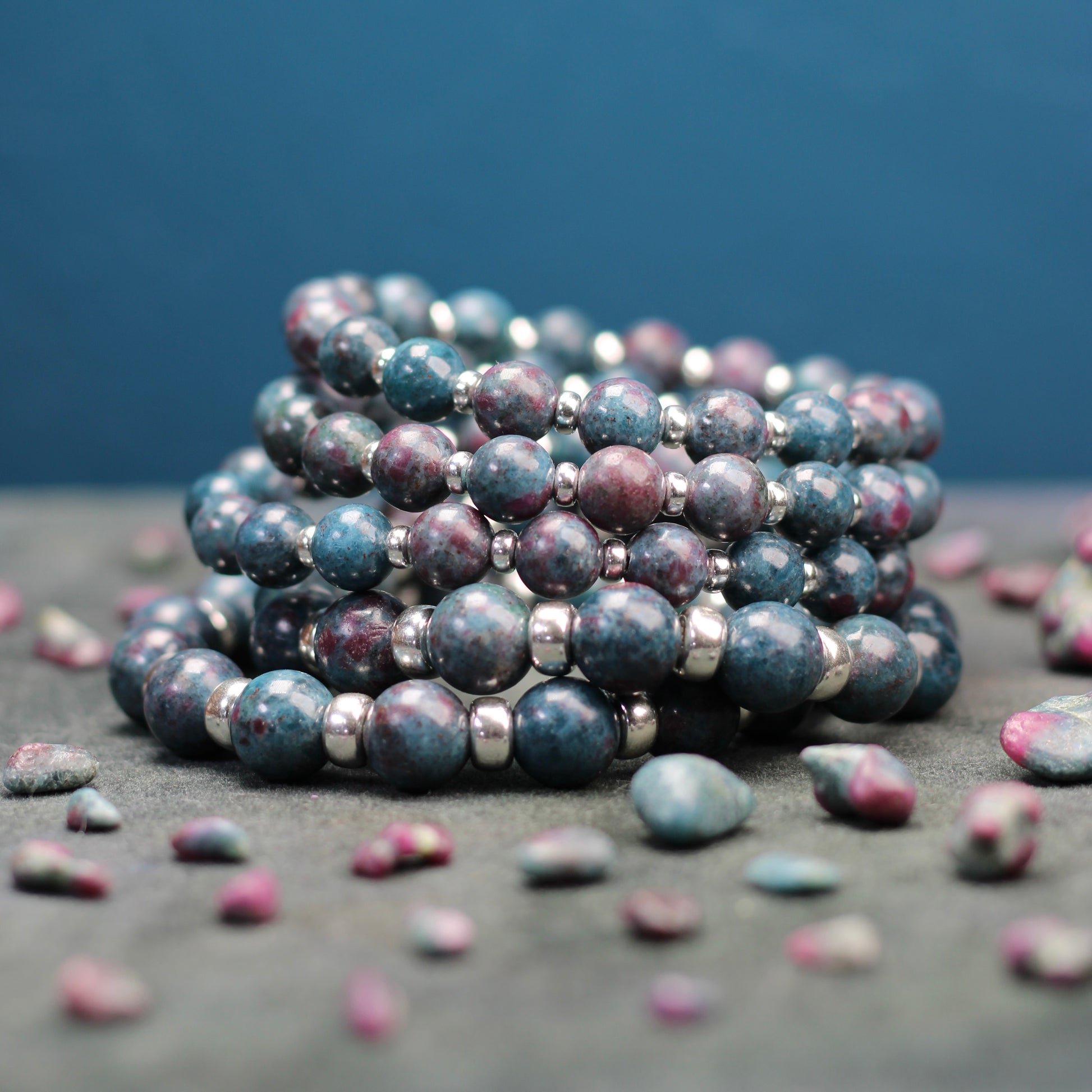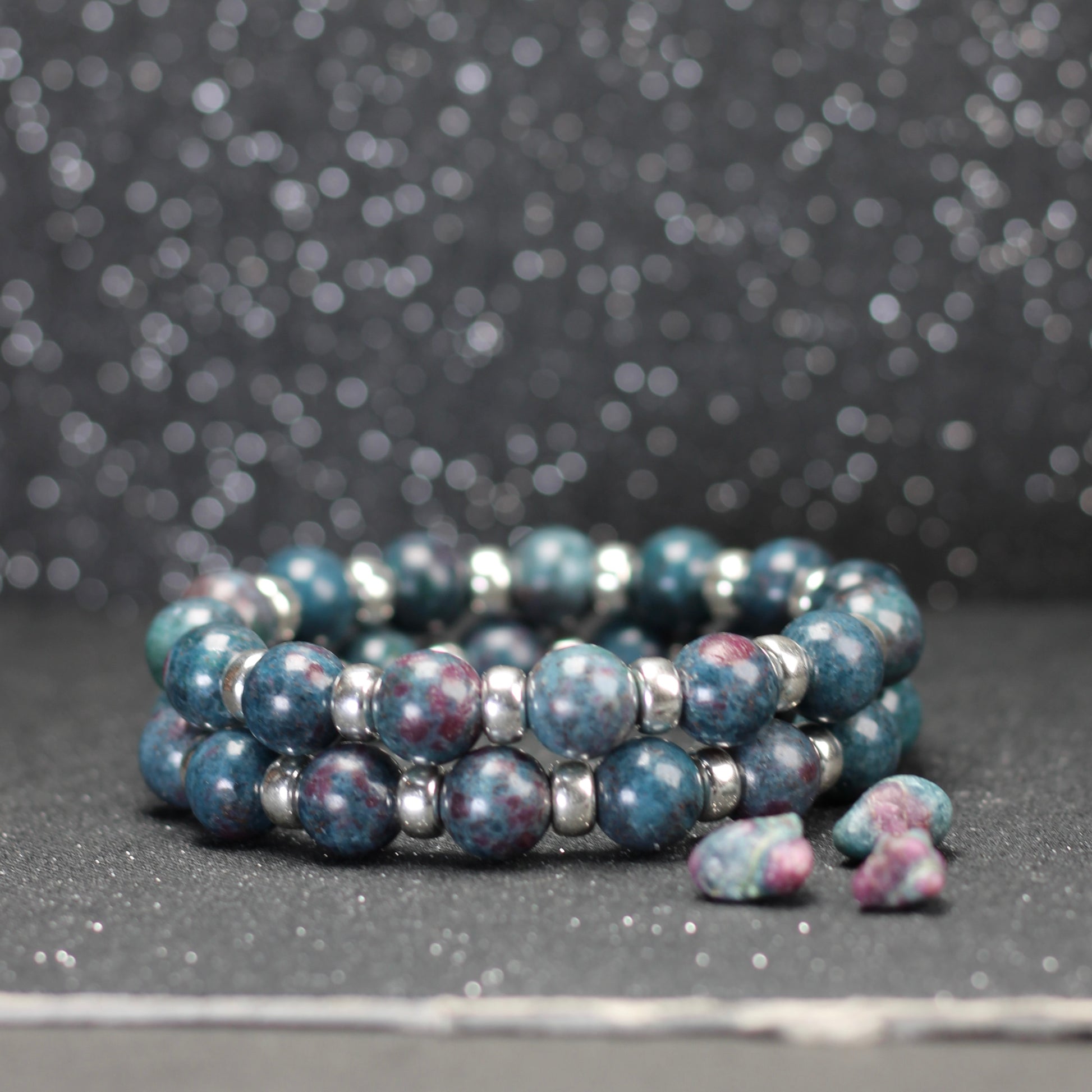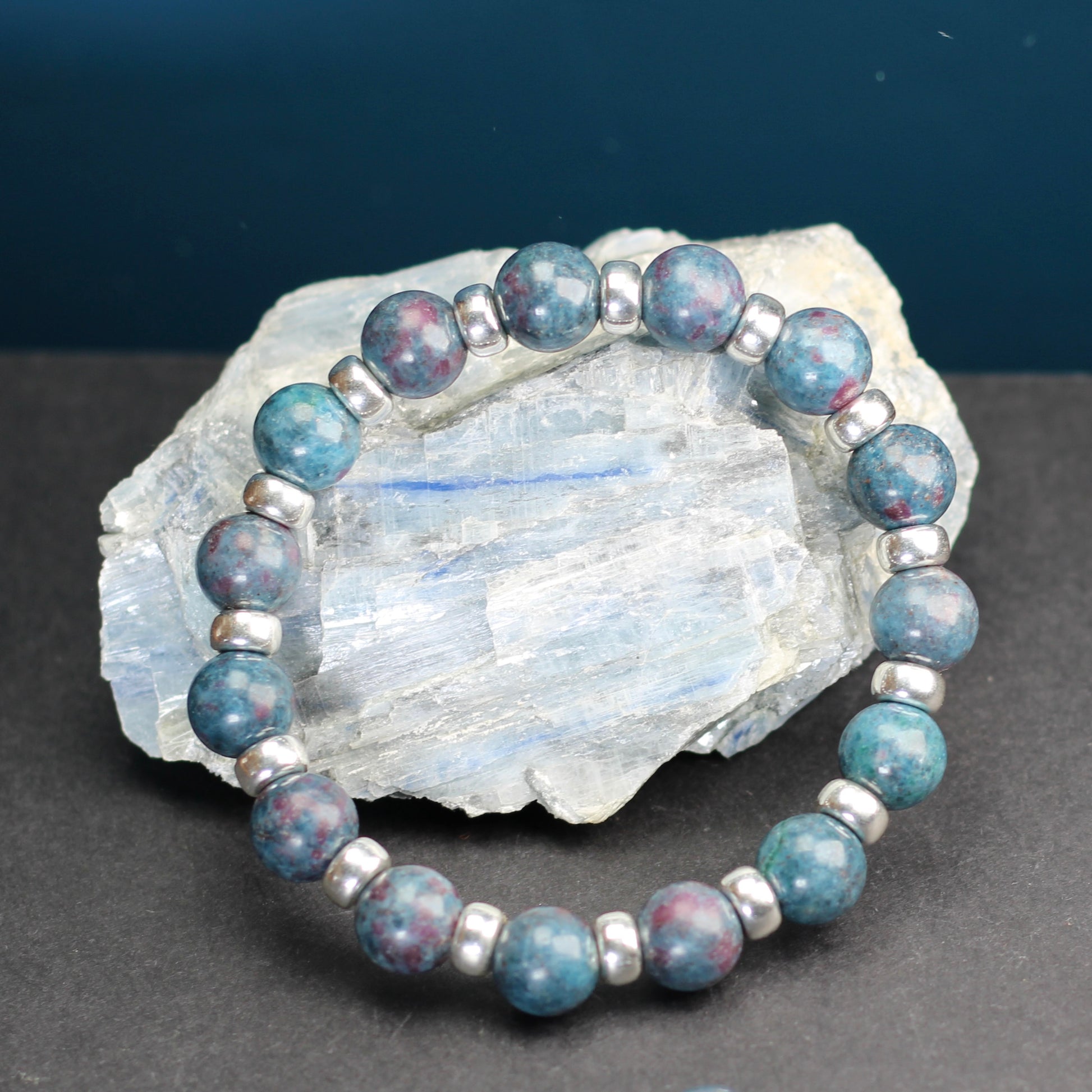These large 10mm Ruby Kyanite beads have been paired with chunky 7mm sterling silver beads to create a substantial power bracelet that is suitable for all. The larger silver beads used in this bracelet are 4x the weight of my 8mm version of this bracelet.