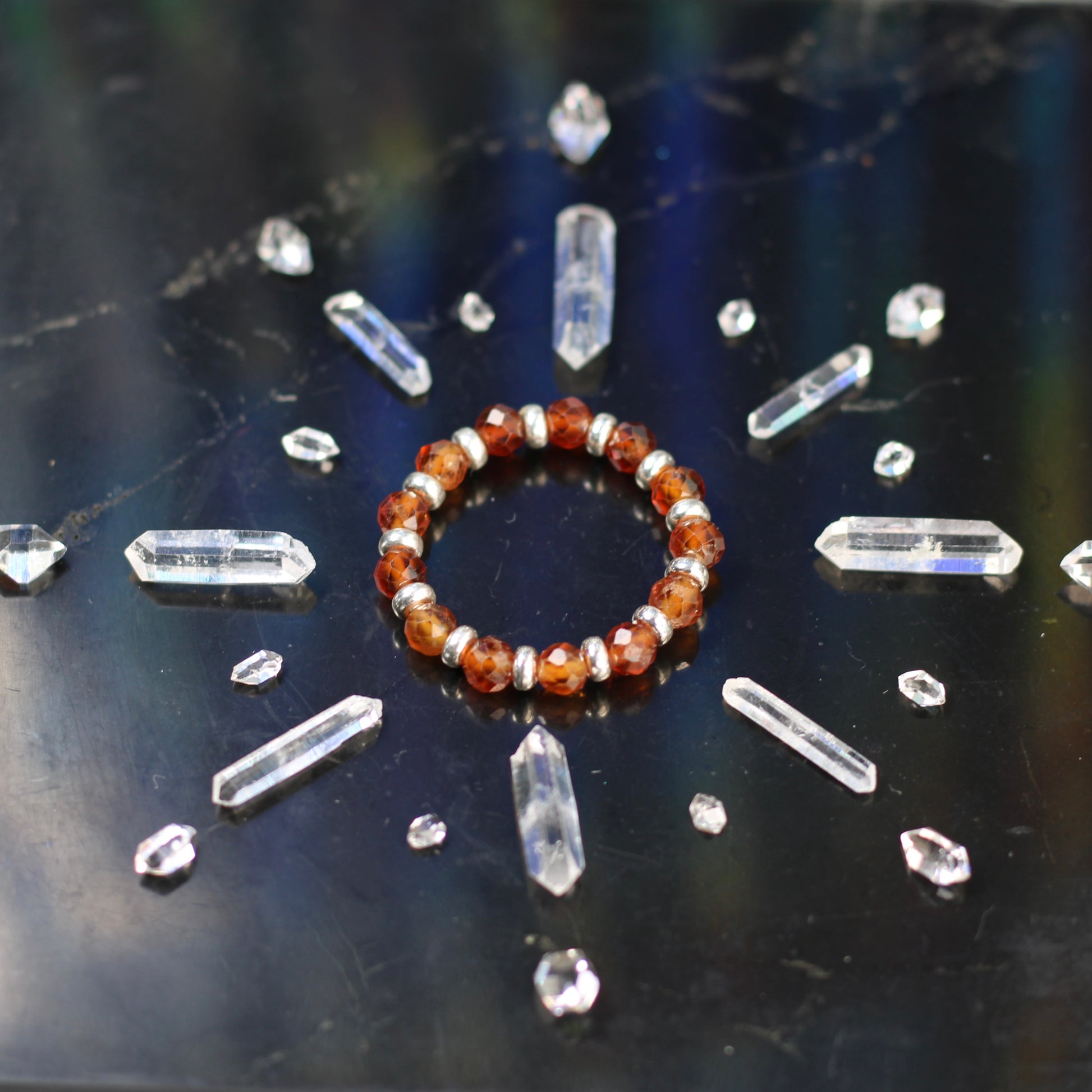 I often use multiple rings, necklaces, bracelets, tumble stones and specimens in my photos, this is to best display the true look and nature of the material. This listing is for one Ring, tin and one Herkimer Diamond.